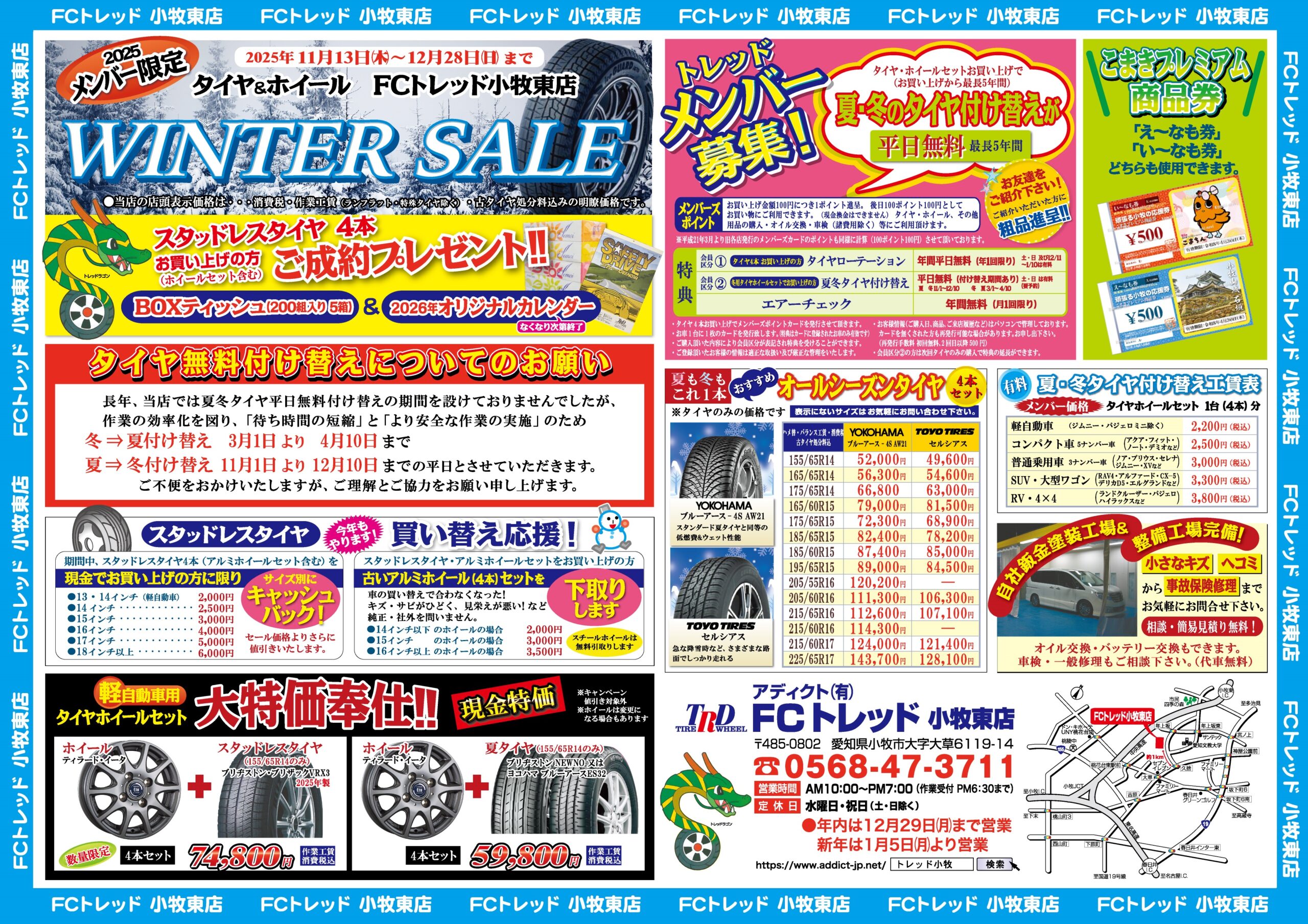 WINTER SALE 2025 開催! ~12/28(日)まで ニュース・イベント 2025/11/8 冬支度はお済ですか? だんだん寒くなってきました。 車の冬支度は急にはできません。 雪が降ってからでは遅いのです。 安心して運転するためにも早めの冬支度をお願いします。 遠出先でも困ることないようにしましょう!! カテゴリ ニュース・イベント メディア 最近のお知らせ WINTER SALE 2025 開催! ~12/28(日)まで WINTER SALE 2023 開催! ~12/26(火)まで WINTER SALE 2022 開催! ~12/26(月)まで WINTER SALE 2021 開催! ~12/26(日)まで ウインターセール開催中 11/1-12/27