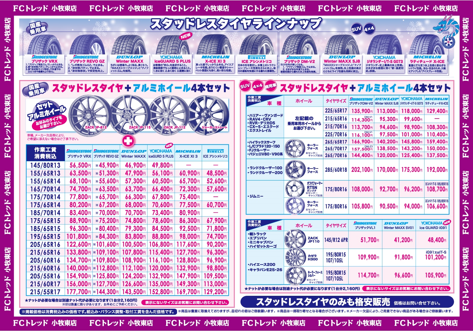 店頭価格は、消費税、工賃、古タイヤ処分料を含むワンプライス安心表示です。